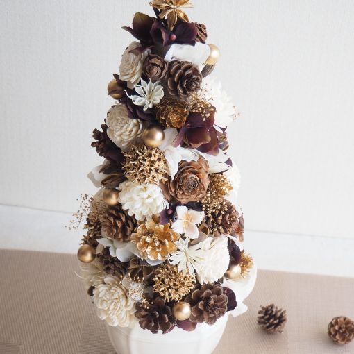 11月、12月のレッスンはクリスマスからお正月まで楽しんでいただけるグリーンと白を基調としたクリスマスツリーをつくります。レッドのバロック風リボンで作った器にシックなグリーンのバラ、優しい風合いのソーラーフラワ​ー、マム、ゴールドやシルバーの実物などを組み合わせます。お正月には器に和紙を巻き付け、水引を付けて飾っていただきます。レッスン中はこの時期ならではの甘くて華やかなアロマの香りをお楽しみください。