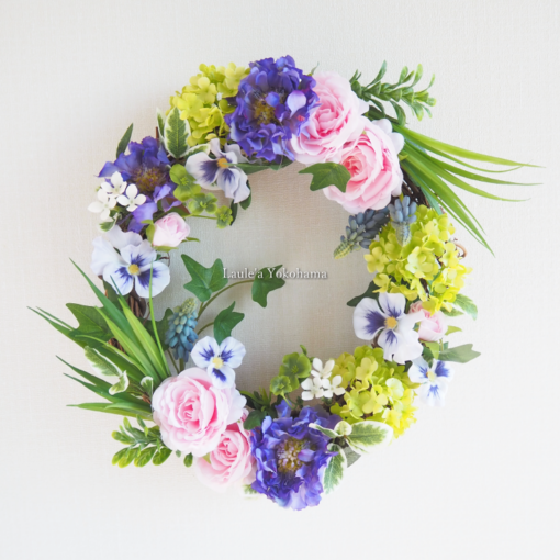 2021年7月の横浜教室は、自然素材のソラフラワー、ドライフラワーなどの花、リーフを盛り込んだサマーバッグリースをつくります。オフホワイトにまとめた上品で涼しげなアレンジメント。仕上げにソラフラワーにアロマで香りづけをして完成です♪
