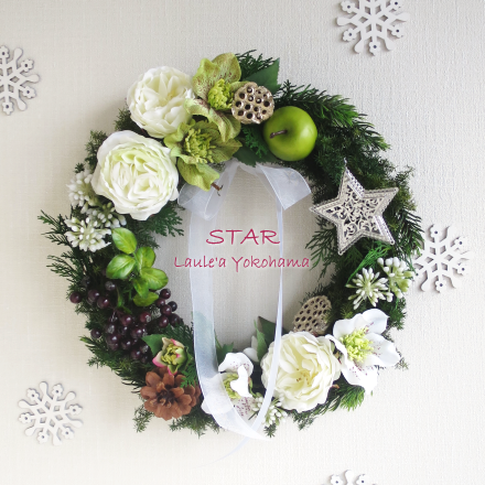11月12月の横浜香り花教室は、クリスマスツリーを作ります。実もの、ソーラーローズなど10種類以上の花材をぎっしりと埋めた、ホワイト、ブラウン、ゴールドの上品なクリスマスツリーです。最後にアロマで香りづけをして完成です。お正月用の水引もお付けいたします。