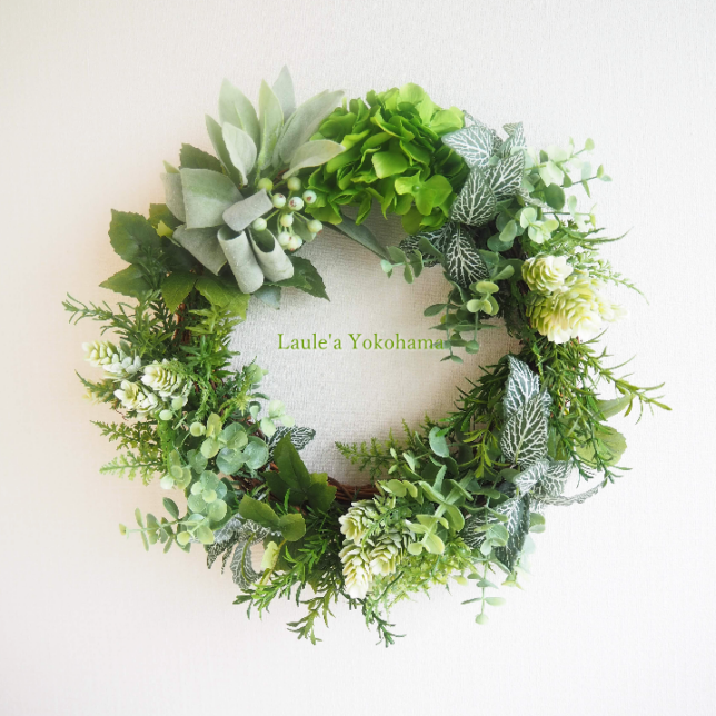 横浜香り花教室の夏レッスンのテーマは、「Summer Green Wreath(夏のグリーンリース)」。6~7種類のグリーンの花材のみでサマーリースを作ります。これからの暑い季節、お部屋に清涼感をお届けします。最後にアロマで香りづけをして、さらに爽やかさをプラスします♪