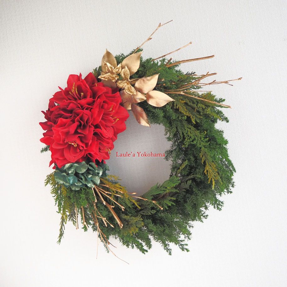 今年は、グリーン、レッド、ゴールドの王道のクリスマスカラーのリースを作ります。プリザーブドフラワーのヒムロ杉、ヒバに、華やかなレッドのアマリリス等の花、ゴールド枝、実もの等を組み合わせます。